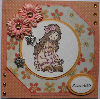 Hi everyone, hope you are all well, I just can't wait for the weekend! I have two posts today, and my first card is for Friday Sketchers Challenge No. 69, a wonderful Sketch by Jacqueline, for which I have used a Whiff of Joy stamp called "Kneeling Willow", and she has been coloured with Sakura Gel Pens. The image has been cut with a round nesty, and layered on orange card. The backing papers are from a paper pack from My Minds Eye called Bloom & Grow. The octagonal shapes have been cut with my Cricut, and to finish the card off - a stamped sentiment, paper flowers with gem brads and butterfly charms, and a few little gems - all from my craft stash.